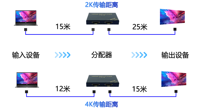 4K分辨率輸入/輸出傳輸距離 12m/15m;2K@60Hz輸入/輸出傳輸距離 15m/25m