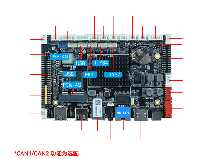 | 擴(kuò)展接口 | USB 3.0 HOST 、USB 2.0 OTG、3×USB 2.0 6×UART、GPIO、PCIE、IR |