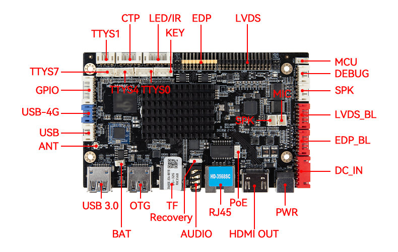 | 擴展接口 | USB 3.0 HOST、USB 3.0 OTG、 2×USB 2.0、4×UART、GPIO、 RTC、IR、PoE、PCIe |