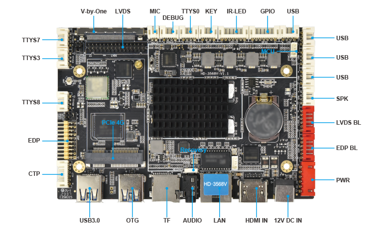 4×USB 2.0、4×UART、 KEY、RTC、PCIe、IR